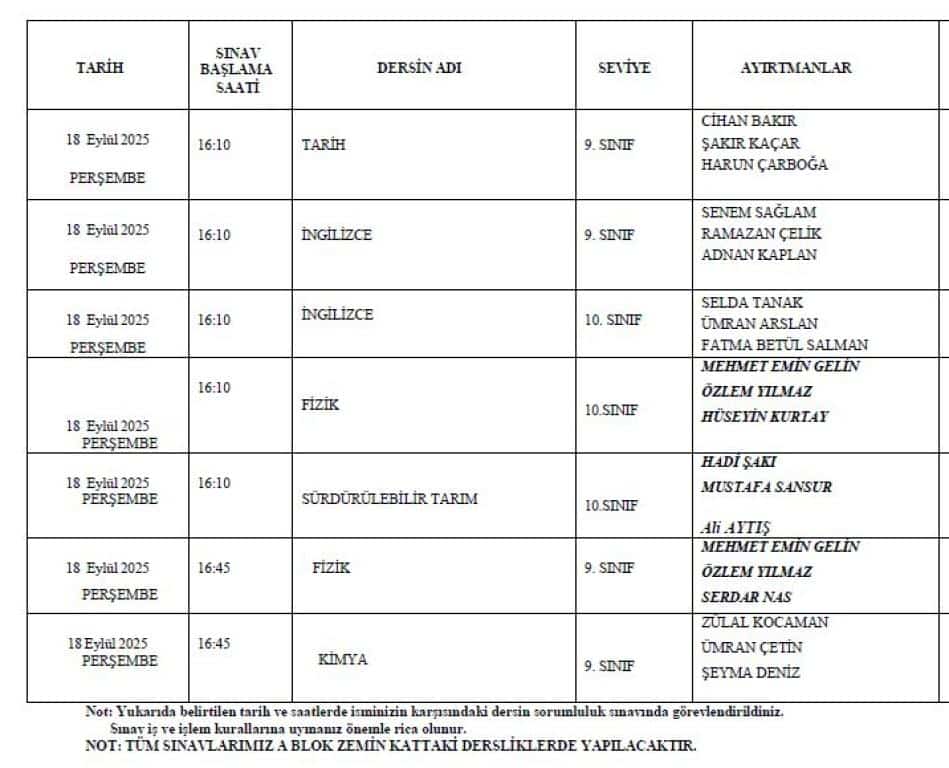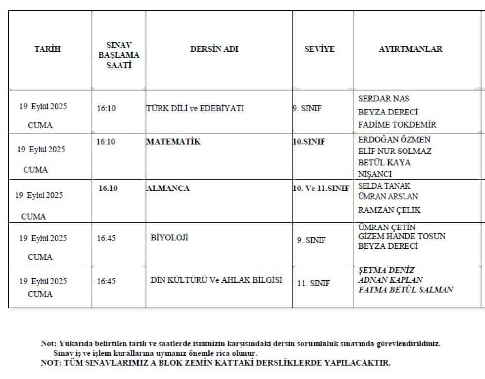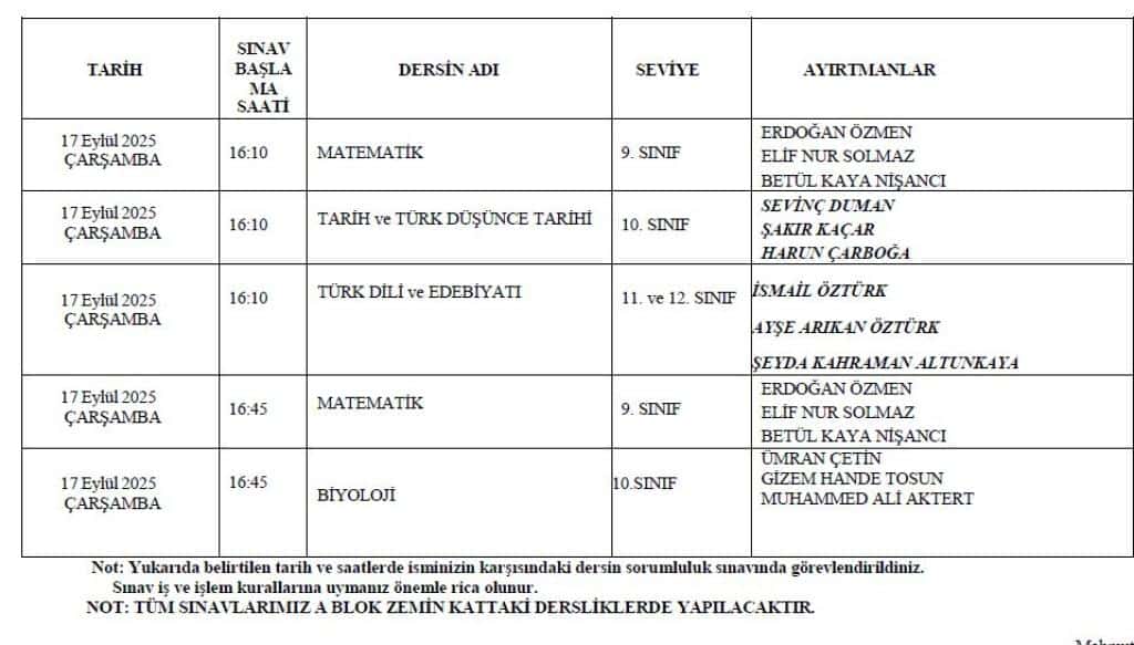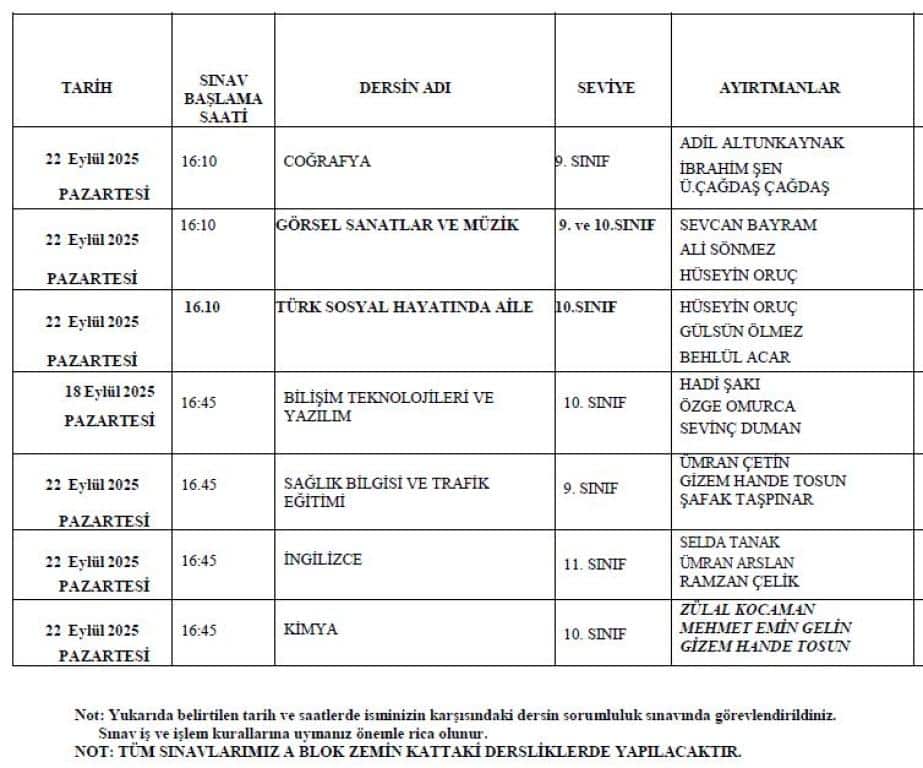 EYLÜL DÖNEMİ SORUMLULUK SINAV TAKVİMİ